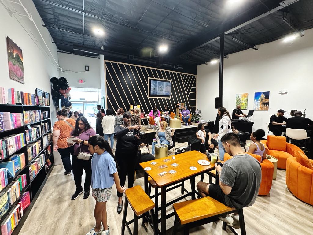 Key details: Coffee shop with tables and chairs, bookstore, small stage