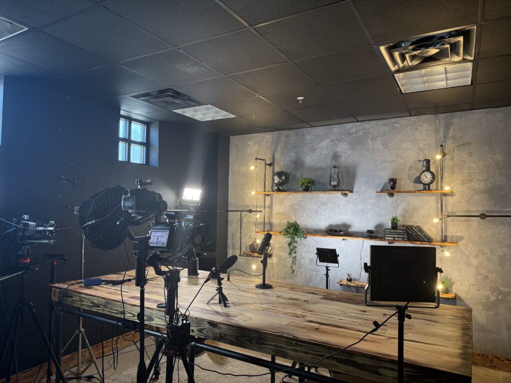 Key details: Podcast and video studio, multi-camera setup, pro lighting
